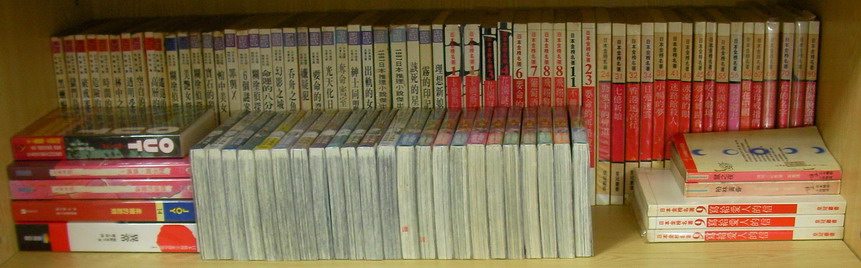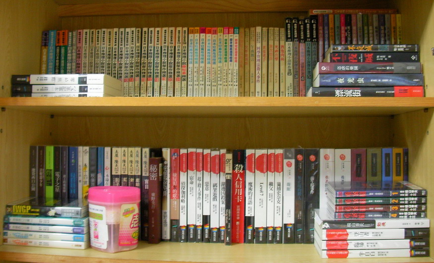 左右書櫃第三層:希代出版、傅博選編的「日本十大推理名著全集」、「日本名探推理系列」、「日本推理名著大展」共33本,這系列傅博先生在最近一次的演講當中曾經提及。皇冠的「日本金榜名著」(缺很多),其中《花園謎宮》有兩本,一本編號為三、一本為四,《飛翔警察》有兩本,《寫給愛人的信》有三本,有需要的朋友拿一本我沒有的推理小說跟我換就好了。前排則是桐野夏生、死亡筆記本、偵探學園Q以及兩本香港出版的連城三紀彥作品《鼠之夜》與《柏林黃昏》(香港推理友人怪人君慷慨相贈)。