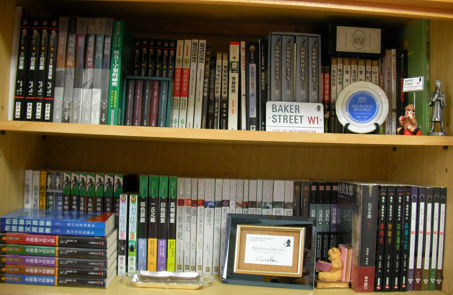 右右書櫃第一層:左起昆恩,加伯黎奧,愛倫坡,柯南道爾(有兩本JET畫的漫畫)。
