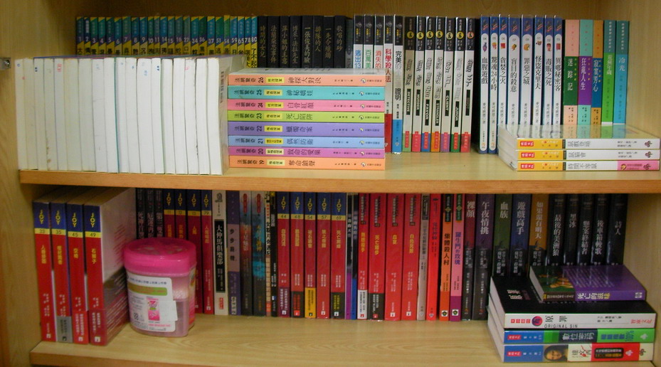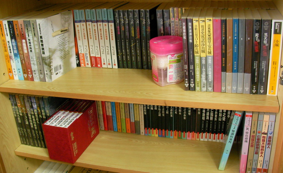 寫完之後才發現,我漏了推理雜誌與謀殺專門店。推理雜誌另存於兩個櫃子,不在這四櫃之中;至於適合擺門面,極不適合悠閒翻閱的厚重精裝謀殺專門店,則被我送給家姊作為新居的書房擺飾了。