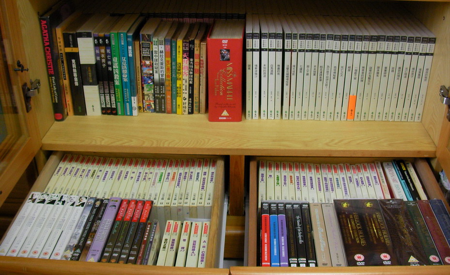 下方抽屜有:風雲時代袖珍版49本(缺《清潔婦命案》,願高價收購),David Suchet演的白羅探案DVD,Margaret Rutherford的瑪波探案電影四部(德國Amazon買的),《死亡約會》電影,《一個都不留》電影(1945年版), 湯米與陶品絲電視劇DVD,《無盡的夜》與《破鏡謀殺案》不在這裡,放錯地方了,《東方快車謀殺案》電腦遊戲,中文VCD的《東方快車謀殺案》與《尼羅河謀殺案》。右下角還有數不清的福爾摩斯探案,推理女神探(Murder, she wrote)。
