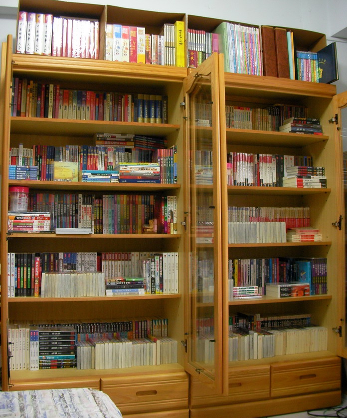 我也應該來買個有門的書櫃,比較不積灰塵.不過有門的櫃子都太深,只能學版主”讓作者自己遮自己”這一招了