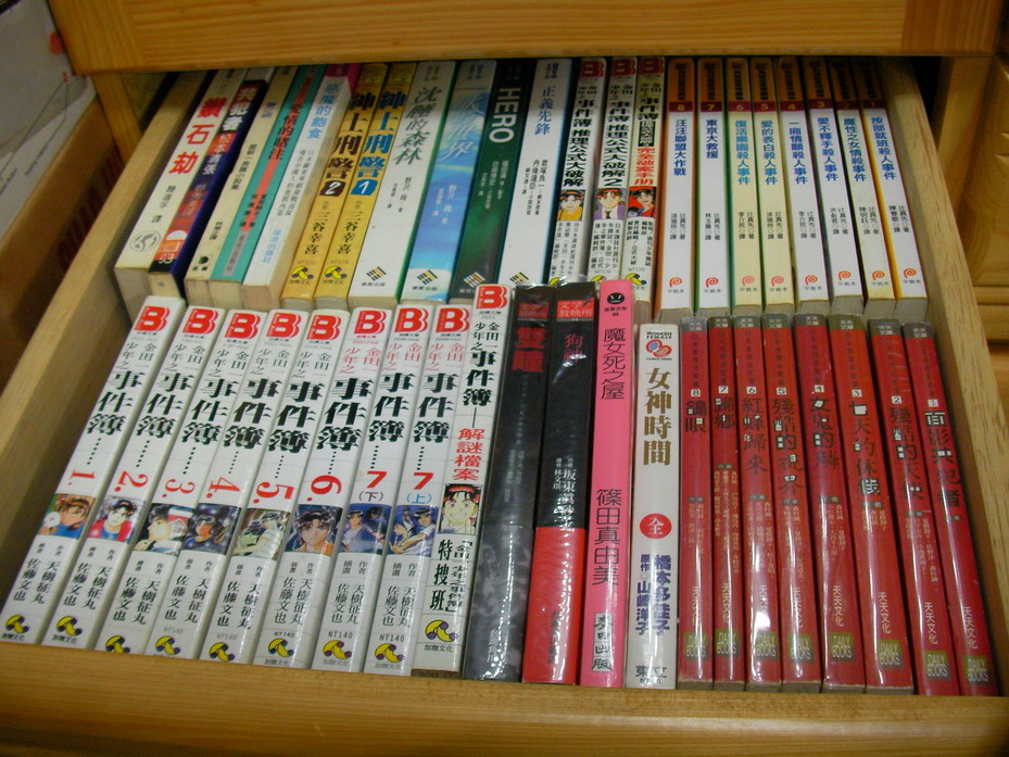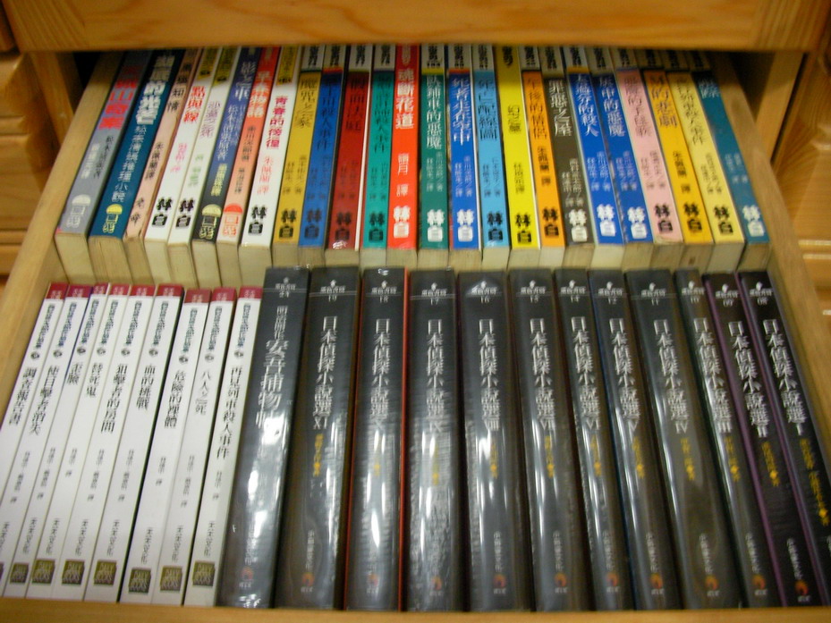 | 狗怪盜,金田一一小說,天天出版的「日本推理名家選」。 | 天天出版的「西村京太郎作品集」,小知堂「黑色書房」。 | 萬象出版的「推理系列」七本,赤川次郎小說集漫畫,花田的三毛貓。 | 花田出版的三毛貓。 |