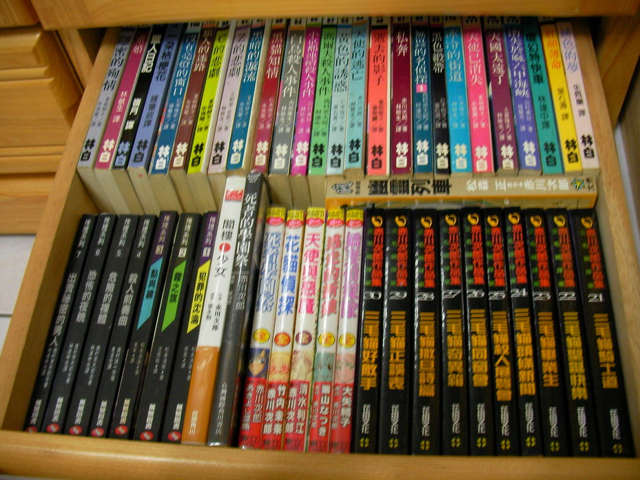 以下則是左邊書櫃下面的四個抽屜,右邊三格上半都是「林白推理小說系列」。