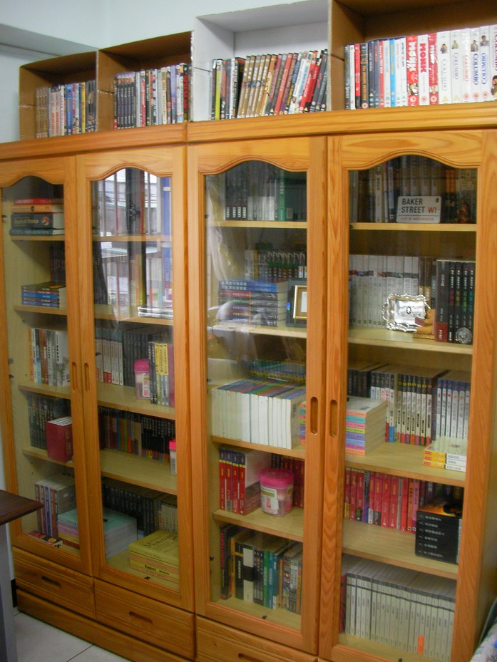 | 房間右側兩個書櫃。關起貌。書櫃之上是A4影印紙的紙箱,目前放的是推理影片,都是DVD。VCD暫時還找不到地方放。 | 打開貌。 DVD是在英國敗家兩年的成果。 |