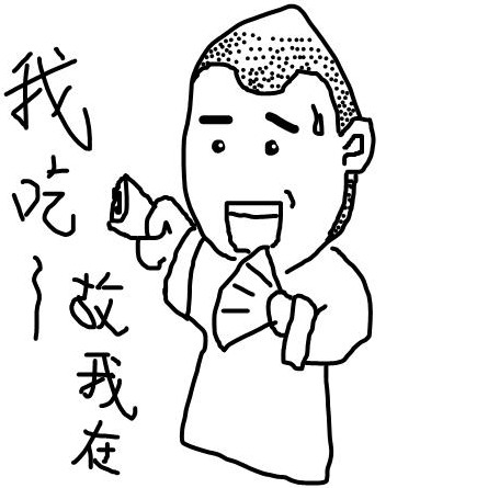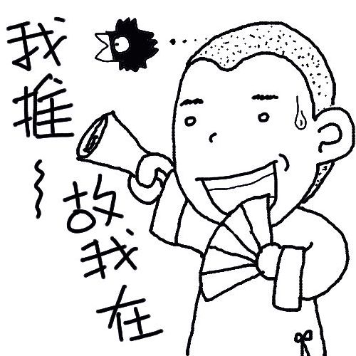 直到最近,我的一位碩班同窗 teresasalee 君,想要挖苦我生活中只有推理小說,實在太過乏味,所以便把我原先使用的小圖,隨意幾筆重新繪製,在臉上加入一滴汗,咧嘴笑得有點僵硬,指著「我推故我在」的標語,加上一隻不識相的烏鴉飛過。(這張圖後來teresasalee君上了色,成為我目前最常用的圖像)