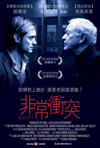 查了一下上映的地點與時間,覺得不很方便,所以就沒去了。那時,我對「偵探」這個字,只知道「Detective」,不知道「Sleuth」也是偵探的意思,真是半吊子推理迷。後來這位好心的Mentor又提供了一張不適合四處宣揚的DVD給我們看,結果不知是什麼問題,只能播三分鐘就當機。所以對本片依舊無緣。