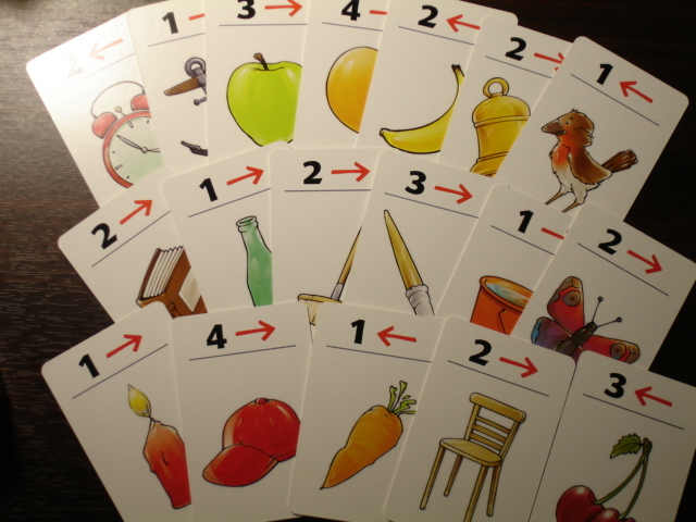 遊戲共有五十張紙卡,一張為偵探卡,四十九張遊戲卡,偵探卡的功能是用來走的,所以要是做成小公仔會更適合,以免唯一一張的偵探卡用久就爛掉了。遊戲卡上面有圖案、箭頭、數字,玩遊戲時僅需記憶圖案即可。