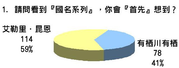 二、艾勒里.昆恩與有栖川有栖的知名度不分軒輊,雖然各有數票表示未曾聽過,但絕大多數投票者(95%)都聽過兩位。