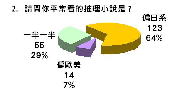 第二題「請問你平常看的推理小說是?」選項有三,偏日系、偏歐美、一半一半。這是為了看出是否偏日系取向的讀者是否就選擇有栖川有栖,而偏歐美的讀者就選擇艾勒里.昆恩。這題也可以順便調查一下現在讀者的閱讀傾向。