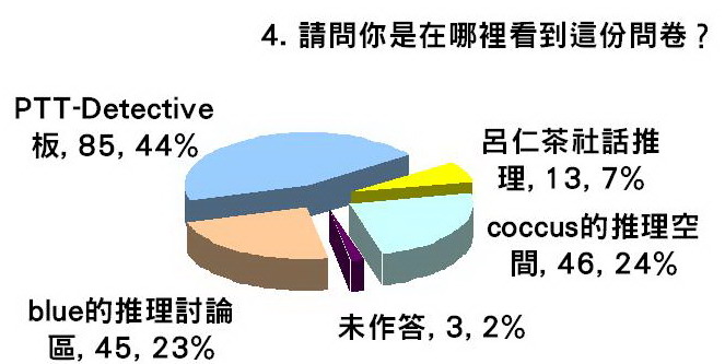第四題是「請問你是在哪裡看到這份問卷?」選項有blue的推理討論區、PTT電子佈告欄Detective板、呂仁茶社話推理、coccus的推理空間。本題用意不在測試各站推理迷出沒數(雖然結果很殘忍地可以看出誰才是台灣推理界主流媒體),而在於考慮到可能不同來源的讀者,對於問題的回答可能有不同的取向。